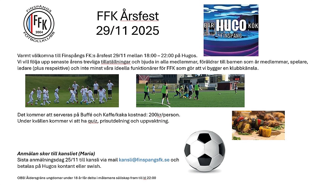 Varmt välkomna till Finspångs FK:s årsfest 29/11 mellan 18:00 – 22:00 på Hugos.